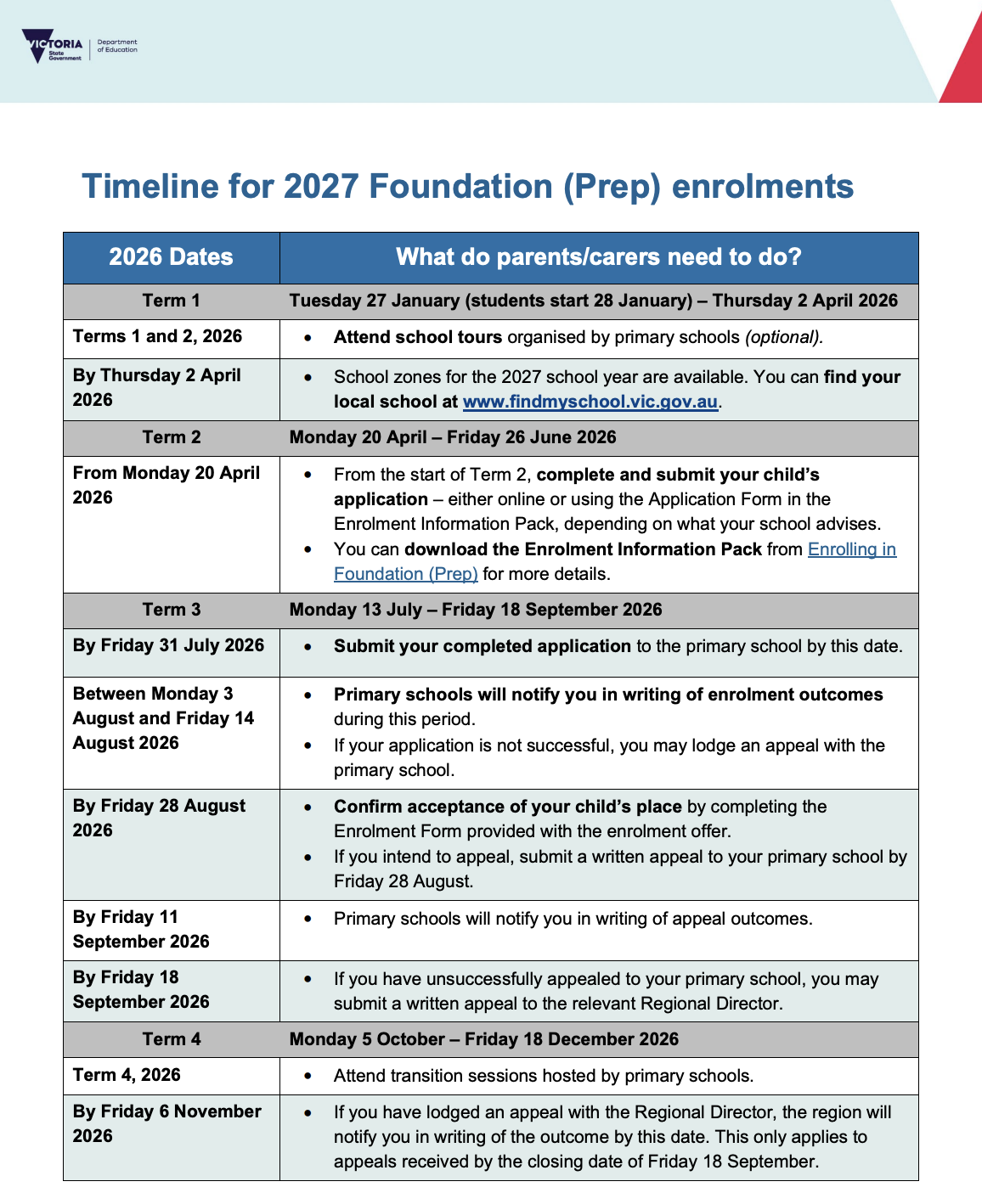 - Click to download the Prep (Foundation) enrolment information pack here. (The pack will be available by Thursday 2 April 2026 and will include an application form).